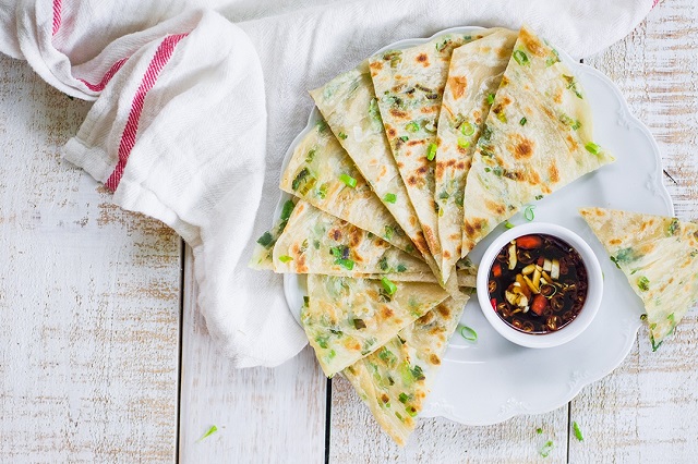 Món ăn đường phố nổi bật ở Đài Loan nữa đó chính là bánh kếp hành lá. Món ăn này được làm từ bột mỳ, hành lá, một chút đường và muối. Bánh sẽ được nướng chín, đến khi có mùi của hành thơm ngon là được. Bánh kếp hành lá khá đơn giản và được nhiều người yêu thích, lựa chọn để thưởng thức.